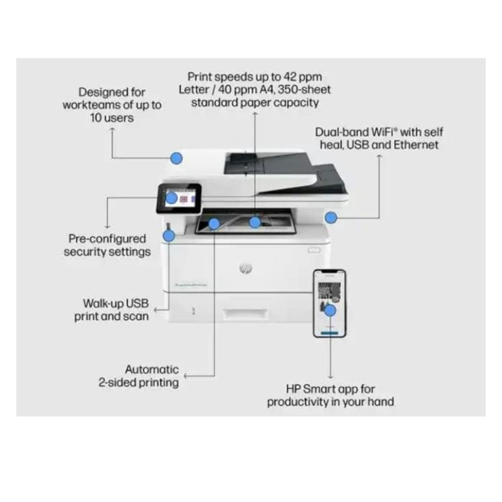 | Boost your office productivity with the HP LaserJet Pro MFP 4103fdw Printer (2Z629A) from HP. Designed for high-performance business environments, this powerful monochrome laser printer offers printing, scanning, copying, and faxing in one compact device. With blazing-quick speeds of up to 40 pages per minute, automatic duplex printing, and 1200 × 1200 dpi resolution, it ensures sharp, professional-quality documents every time. Built for efficiency, it supports mobile printing via HP Smart App and offers seamless USB connectivity. All-in-One: Print, Scan, Copy & Fax, fast print speed up to 40 ppm (A4), automatic duplex (double-sided) printing, high-quality output (1200 × 1200 dpi), ADF (Automatic Document Feeder), USB connectivity for direct printing & scanning, HP Smart App for mobile productivity, network-ready for office environments. Performance Print Speed: Up to 40 ppm, Copy Speed: Up to 40 ppm, Resolution: 1200 × 1200 dpi, monochrome laser output. Paper Handling: Paper Size: A4, Input Tray: 1, Input Capacity: 40 sheets, Output Capacity: 40 sheets, Duplex Printing: Automatic. Connectivity USB Port: 1, Mobile Support: HP Smart App (iOS/Android), Compatible Devices: Smartphones, PCs |