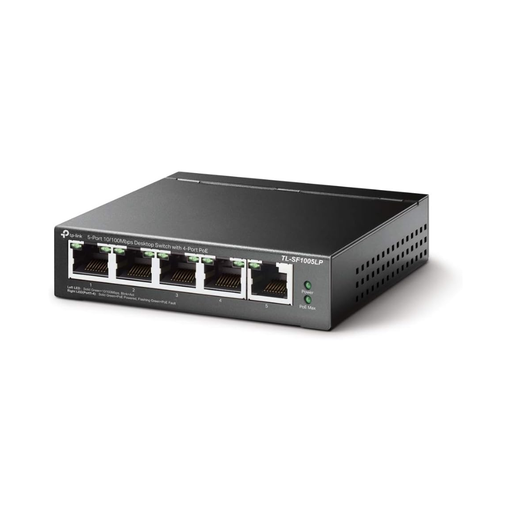 The TP-Link TL-SF1005LP is a compact 5-port 10/100Mbps desktop switch for small offices and home networks. Features 4 PoE ports delivering both power and data over single Ethernet cables, simplifying installation for IP cameras, access points, and VoIP phones.
